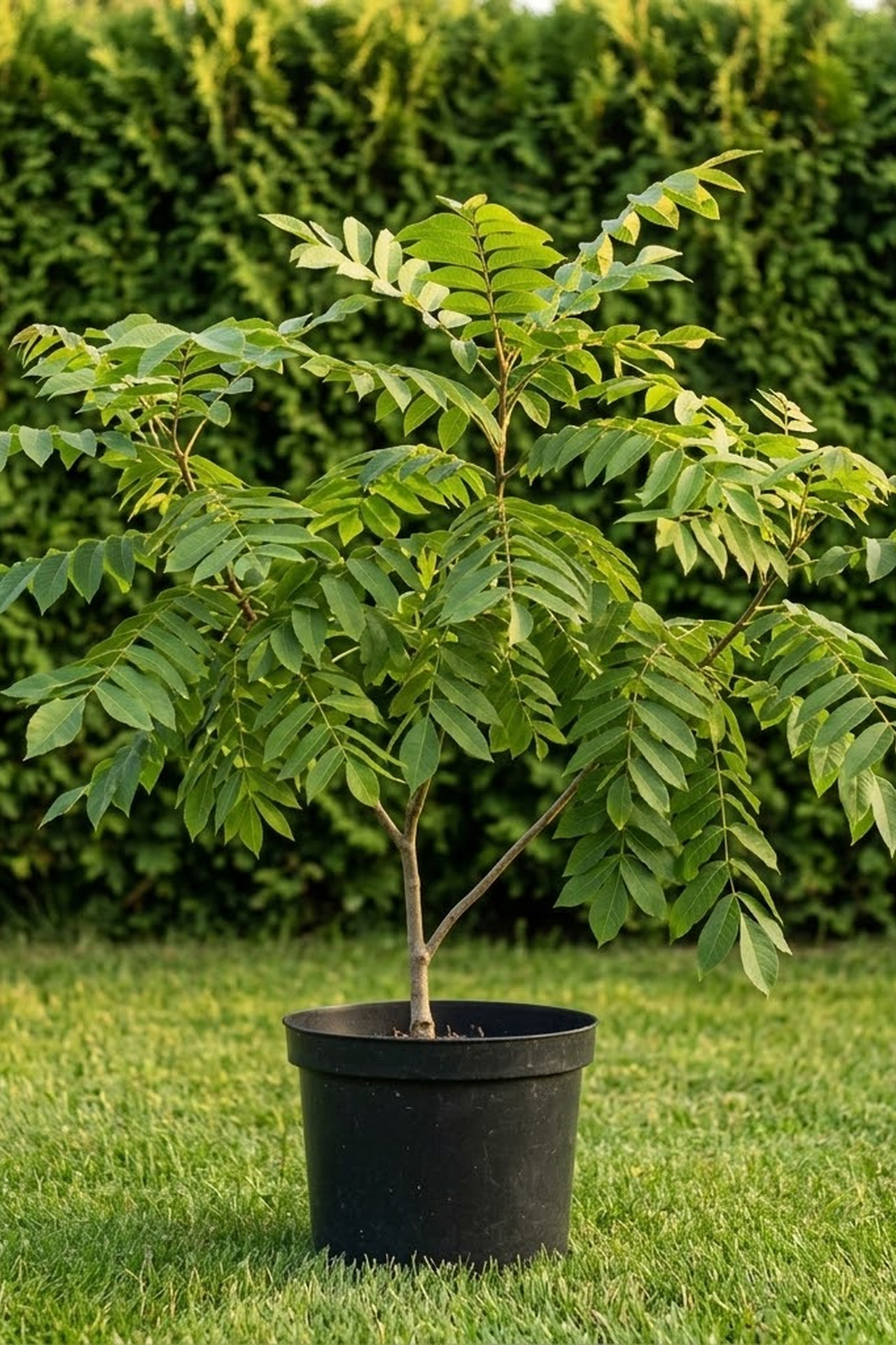 - Листья характеризуются довольно большими размерами. Один лист состоит из 8-20 продолговатых и более мелких листочков с зазубренными краями. В среднем общая длина составляет около 50 см, но встречаются экземпляры с размерами, достигающими 100 см. В летний период листва обладает насыщенным изумрудным цветом, к осени же обретает золотой оттенок.