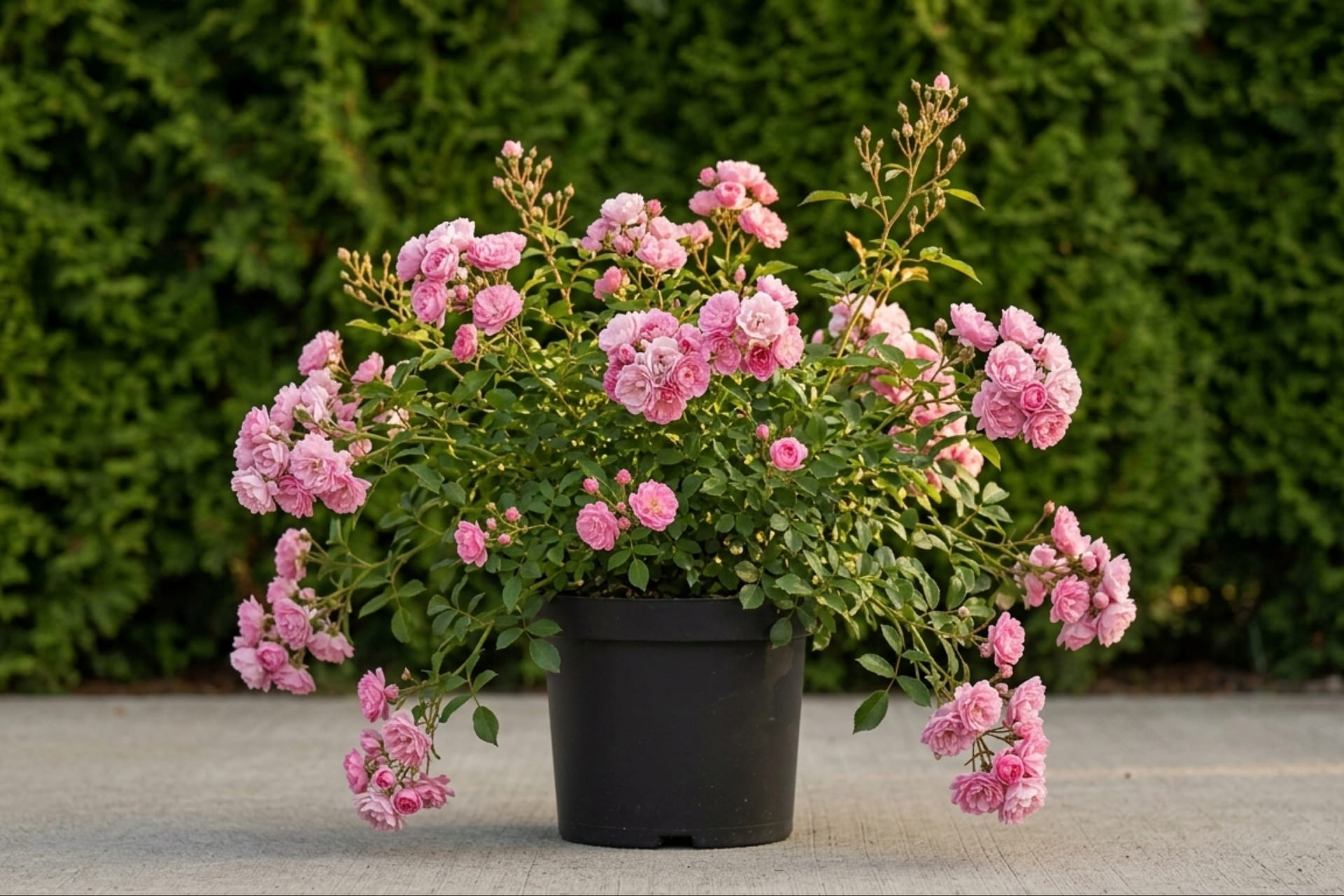 Куст раскидистый, густой, высотой и шириной около 90 см. Цветы ярко розовые, со временем бледнеют по краю лепестков, махровые, мелкие, собраны в кисти. Устойчив к грибным заболеваниям.