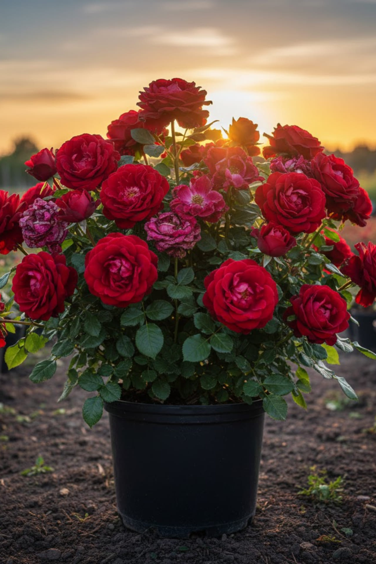 Бутоны овальные. Цветки вишнево-красные, удлиненные с острым центром, крупные (11 —12 см), махровые (60 лепестков), слегка душистые, стойкие. Листья темно-зеленые, блестящие. Шипы частые. Кусты сильнорослые (80—100 см), очень густые, прямые, стройные. Цветение обильное. Зимостойкий. Для групп, срезки, штамбовой культуры.
