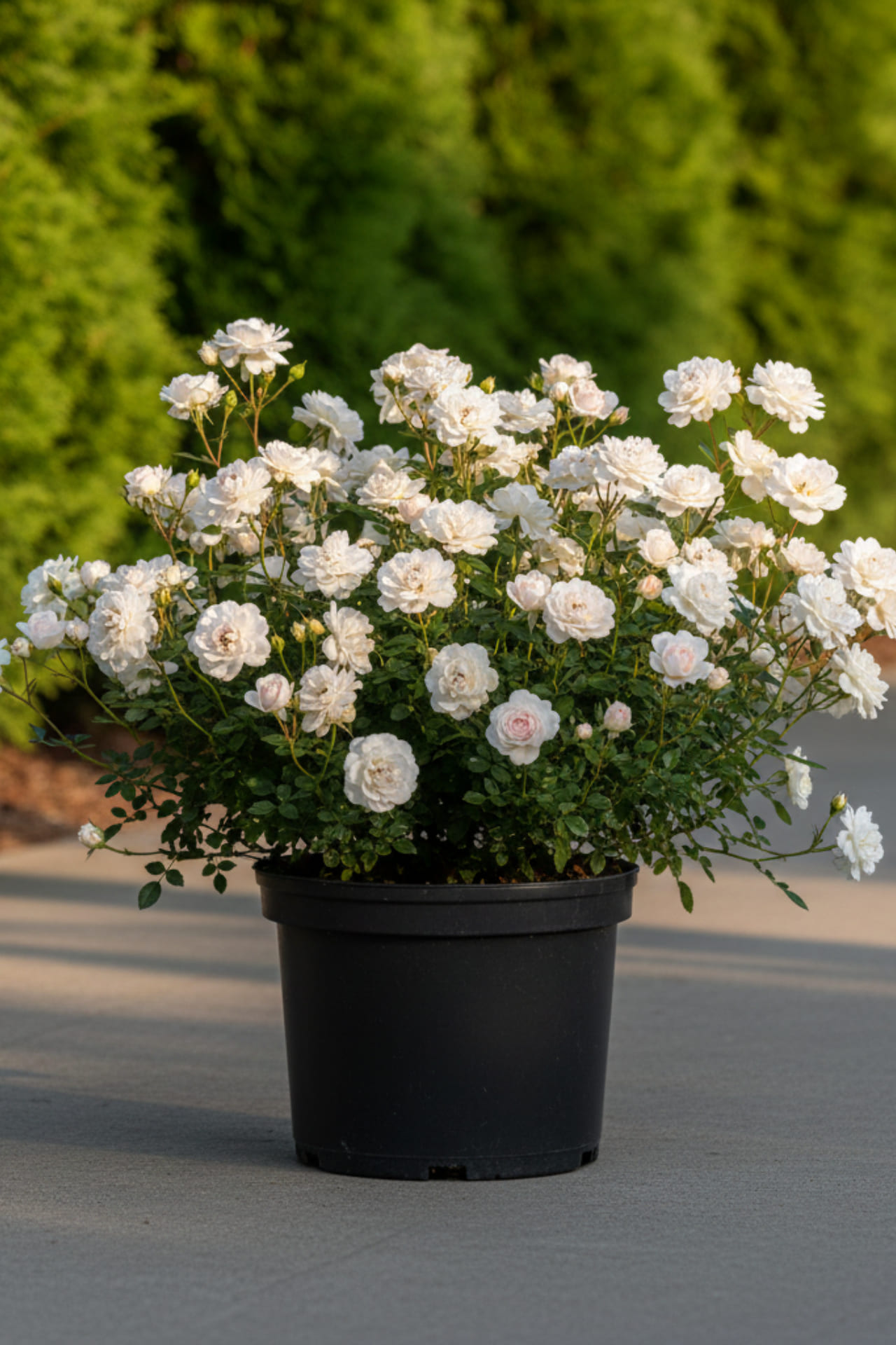Куст раскидистый. Белоснежные цветки, бутон не большого размера.Довольно устойчивы к болезням и дождям